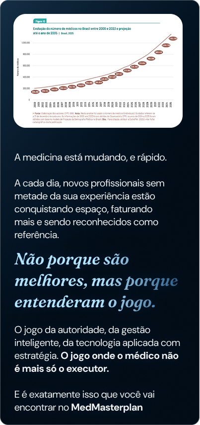 Sim. O MedMasterplan foi criado para médicos e executivos da área de saúde e qualquer área que desejam escalar sua carreira com visão estratégica, inovação e posicionamento. Aqui, a sua especialidade importa menos que a sua ambição de crescer com inteligência.